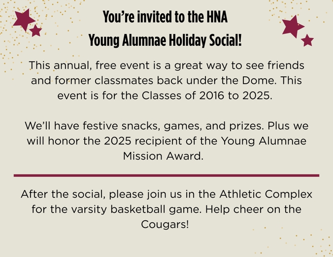 Grab your alumnae friends and register soon because the class with the highest attendance wins a prize! Check back soon with more information about the basketball game following this event.