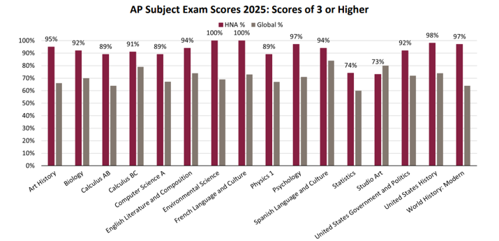 In 2025, HNA proctored 832 exams to 377 students. The breadth of HNA students’ success is represented in the following graphs, which show the percentage of HNA students achieving a grade of 3 or higher, 94% in 2025, and HNA students’ scores compared to national scores.