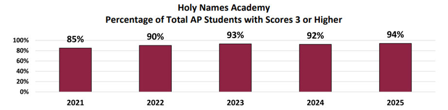 Holy Names Academy is strongly committed to offering its students access to AP courses and national testing in a wide range of subjects. All students enrolled in an AP class at Holy Names Academy are required to take the corresponding AP exam, and they routinely score well above both national and global averages.