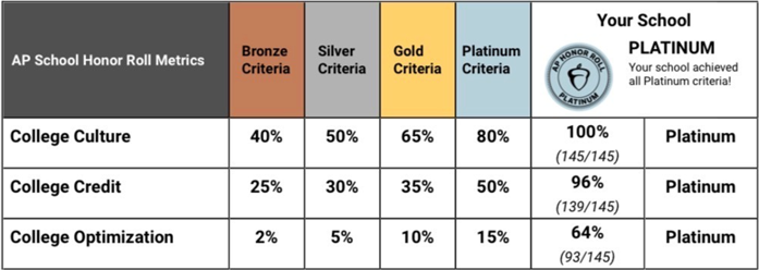 College Credit: Assist with college affordability by enabling 50%+ of the Class of 2025 to earn college credit by earning an AP Exam score of 3.