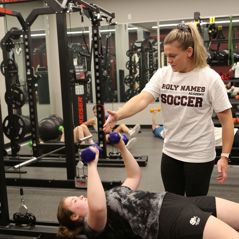 All Holy Names Academy Athletes receive direct access to Certified Athletic Trainer Julia Olson, who provides personalized, one-on-one care on campus during the school day. From preventative treatment and injury evaluations to customized return-to-play plans, Trainer Julia ensures HNA's athletes stay healthy and strong. She is a Strength and Conditioning Specialist and leads free classes to help HNA athletes build their resilience and confidence. She also travels with teams to provide real-time support.